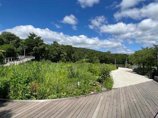 Muscota Marsh is unusual for having both a freshwater marsh and a salt marsh in such a tiny area. Besides attracting plant and animal life, these wetlands are intended to help filter rainwater runoff and thereby improve the water quality of the river. Other facilities include a dock for kayaks and canoes, benches and walking paths. A wooden deck overlooking the river provides views of Inwood Hill Park, the Henry Hudson Bridge and the New Jersey Palisades.