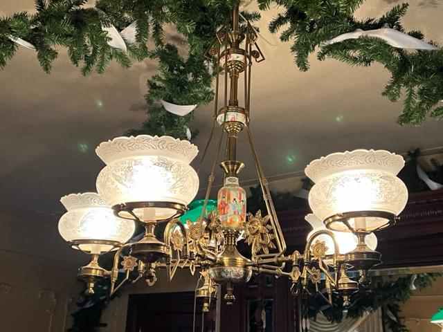 The ceiling and fixturing of the hallway. The Chandelier was created with both gas and electricity when it became available. When the ceiling had to be repaired, the members had to use different materials to match what was already on the ceiling and you would never know the difference.