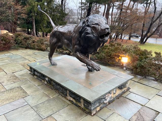 The Blauvelt Art Museum lion statue “Fides et Virtus” by artist Aaron Yount outside the museum.
