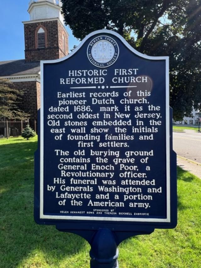 The Reformed Church was nominated to the National Register of Historic Places on April 25, 1983. Included in this nomination was the “Green”, which is one of the oldest public squares in New Jersey. This area encompasses the Churchyard, the cemetery, the church outbuilding and the green area that is adjacent to the Bergen County Courthouse. There are a few monuments that occupy this space, including a statue memorial to General Enoch Poor, which was dedicated in 1904 and the Hackensack War Memorial, which dates to 1924. The church continues to be a prominent feature of the history of Hackensack through community and self-guided walking tours. In addition to this, there are yearly Memorial Day commemorations, where a wreath is placed over General Enoch Poor’s grave and a tour of the church is provided to the attendees of the celebration.
