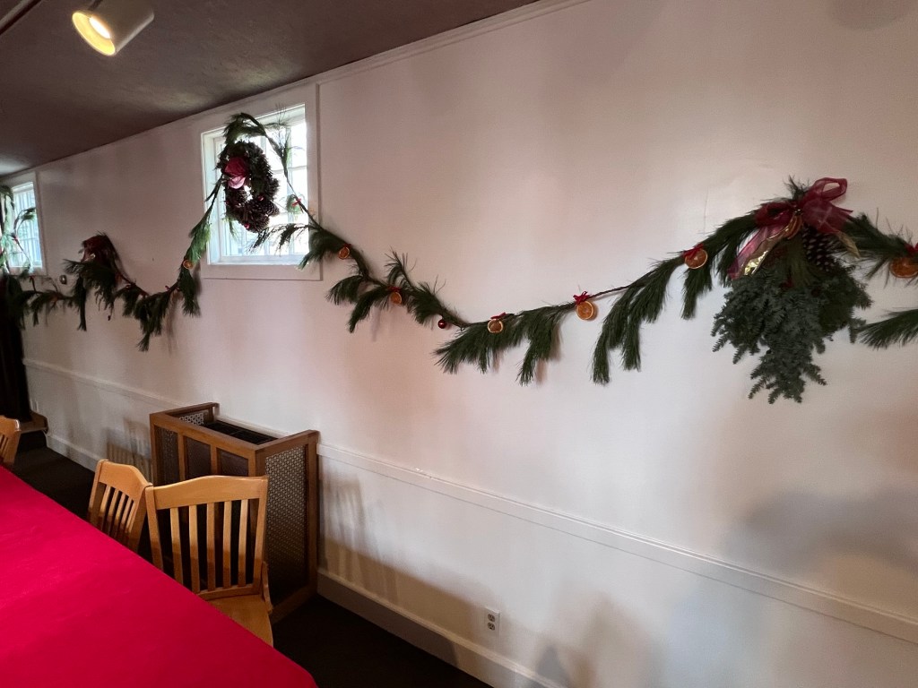 The meeting room was decorated for the holidays for refreshments and good conversation