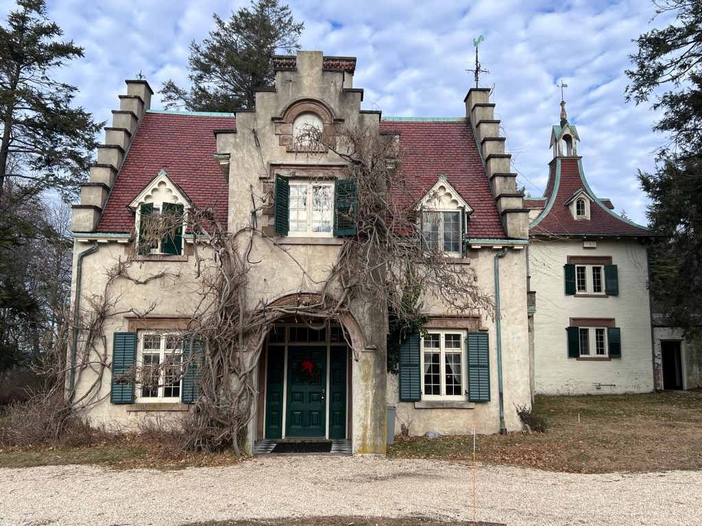 The house was designed by architect George Harvey and reflects the Dutch Colonial Revival, Scottish Gothic and Tudor Revival influences with wisteria growing up and around it and a jagged crow stepped gable.
