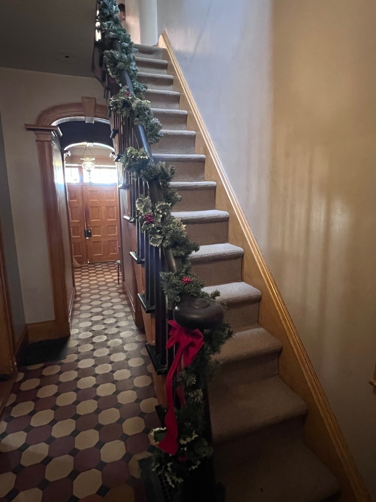 The hallway and stairs decorated for the holidays