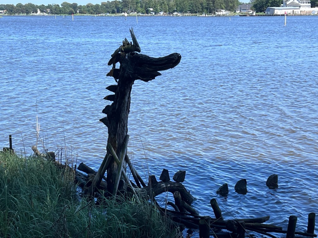 The Sea Serpent sculpture in the Inlet at Pepper Creek, a mixture of Salt and Fresh water