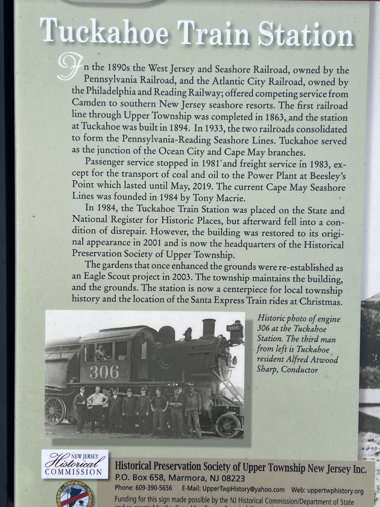 In 1984, the Tuckahoe Train station was placed on the State and National Register for Historic Places, but afterward fell into a condition of disrepair. However, the building was restored to its original appearance in 2001 and is now the headquarters of the Historical Preservation Society of Upper Township.