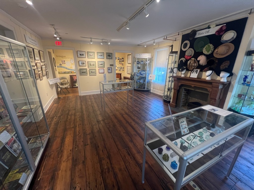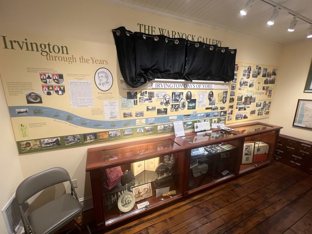 The main gallery of the Irvington Historical Society . The ‘Collections ‘ exhibition is to the front and the small permanent collection is towards the back.