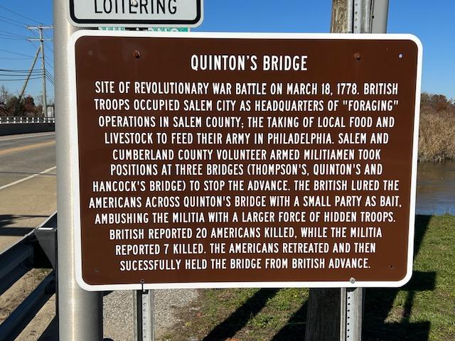 Local citizen had moved some of the cattle south of Salem, past Alloways Creek to keep it from the British. Alloways Creek extends abou thirty miles inland from the Delaware River, creating a natural southern boundary that could only be crossed at three bridges in the area; Quinton’s Bridge, Hancock’s Bridge about four miles east of here and Thompson’s Bridge about five miles to the west. Salem and Cumberland County militiamen took positions at the bridges to stop the British from moving past them.