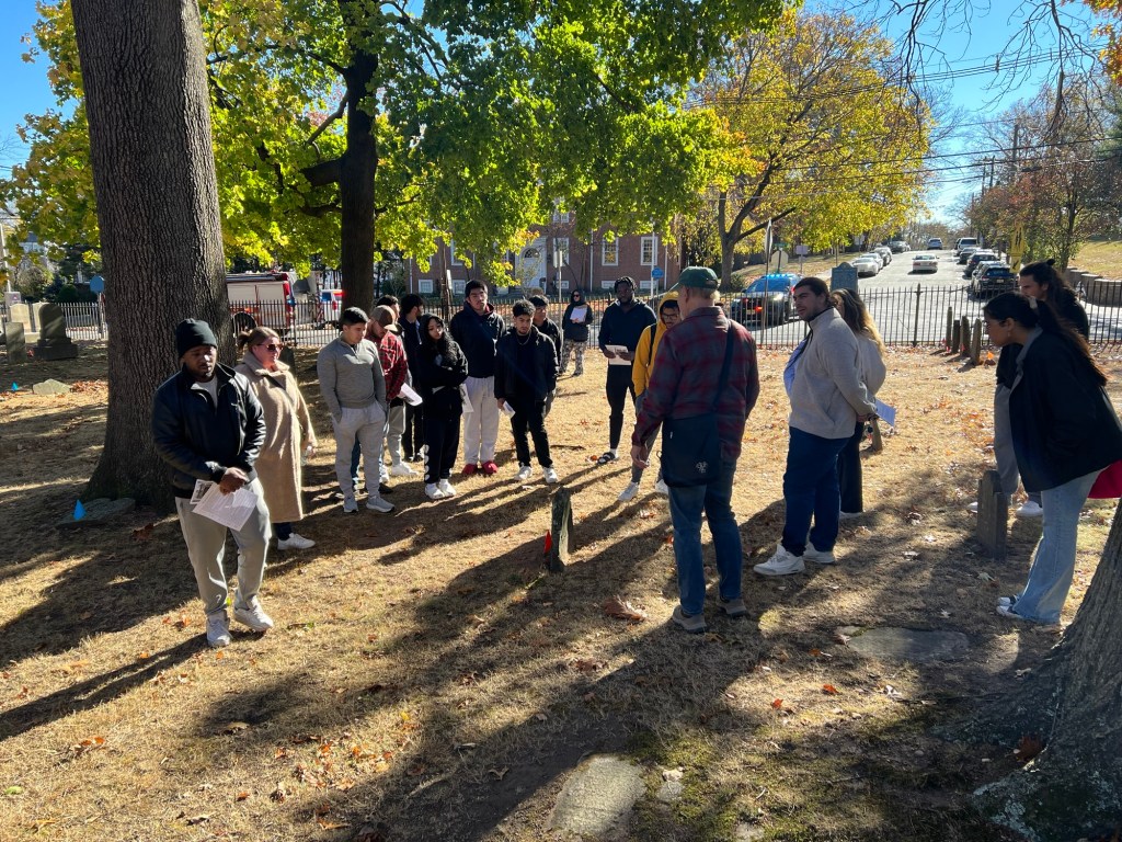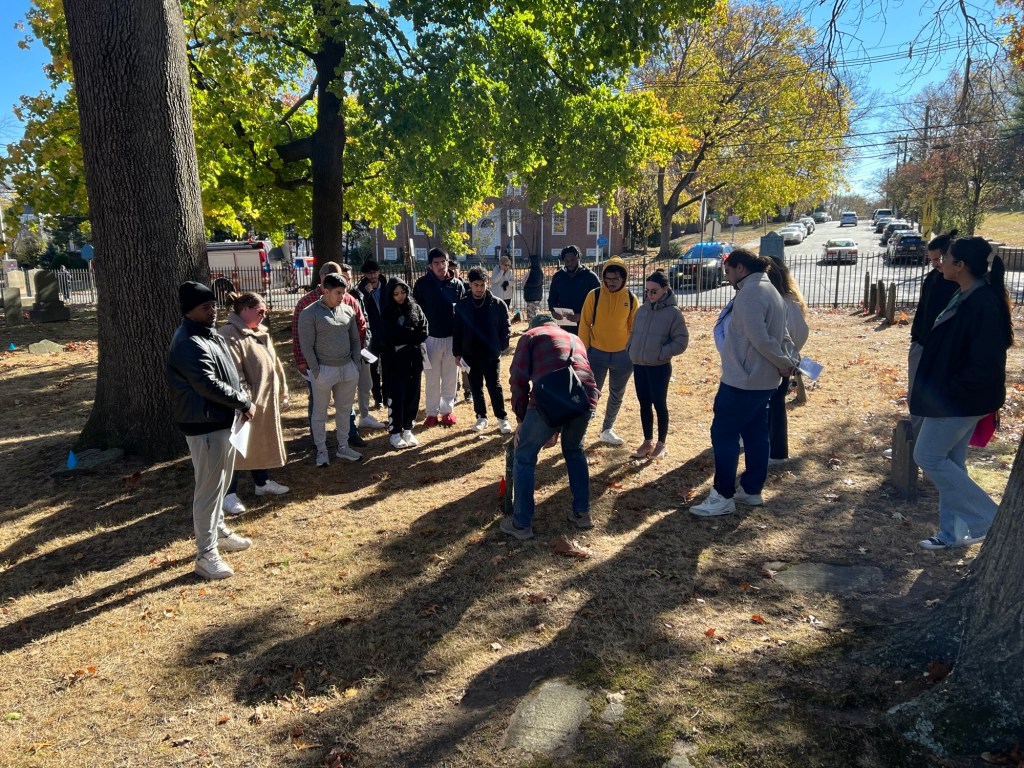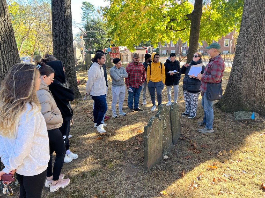 Touring the South Church graveyard for the historical walking tour with members of the Church volunteer staff
