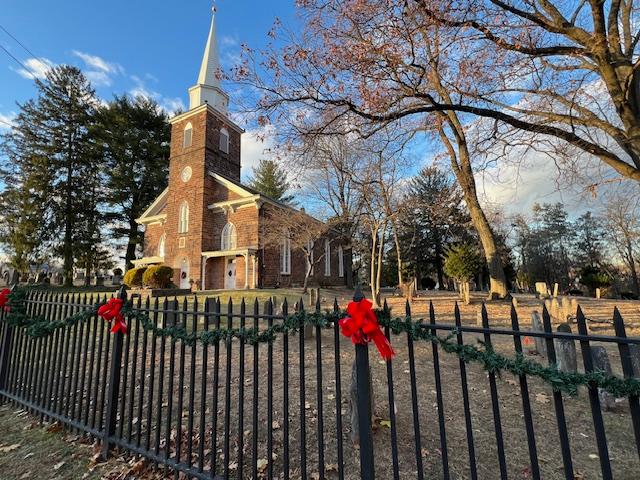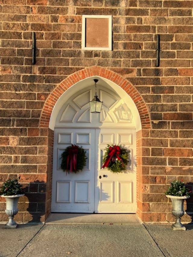 The outside of the church decorated for the holidays
