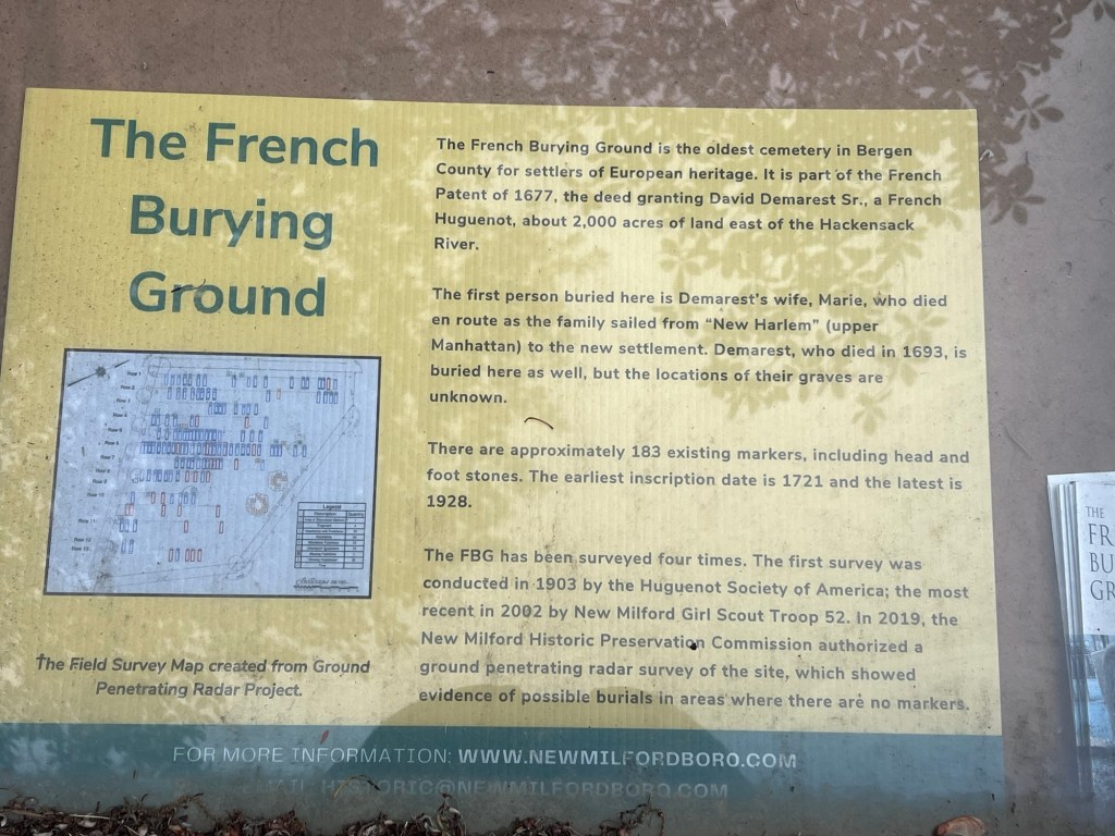 The French Ground is a small historic cemetery once sat next to the French Church and the David Demarest House, that has since been moved to the Bergen County Historical Society site.