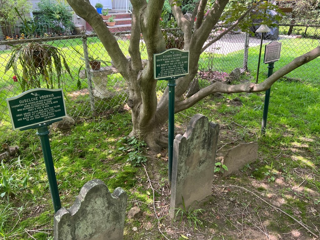 The Voorhis Family Burying Ground was once part of the extensive farm owned by Henry Van Voorhis. This small burial plot houses this branch of the family and sits in what used to be the southeastern section of the farm. Now it sits behind a small house in need of a good lawn cutting.
