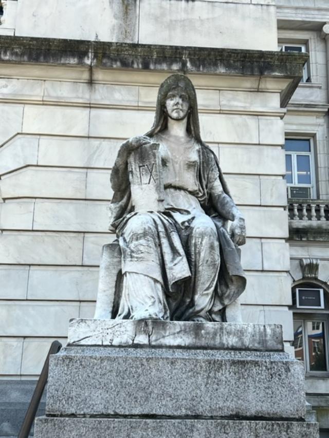 Designed by James Riely Gordon, in the Beaux Art style reflecting monuments of classical Rome and Italian Renaissance, the Court House incorporated rich materials including marble and bronze. With a dome modeled on the U.S. Capital, it incorporated other art forms including painting, sculpture and stained glass. The exterior contains many sculptures including the female statue of “Enlightenment Giving Power” on the dome’s cupola. The dome’s interior is decorated with Tiffany stained glass panels. Three of the courtrooms have elaborate stained glass skylights fabricated by the famous Lamb Studios. Some of the courtrooms also contain large murals painted in the 1930’s by artists working for the Federal Art Project of the Works Project Administration.