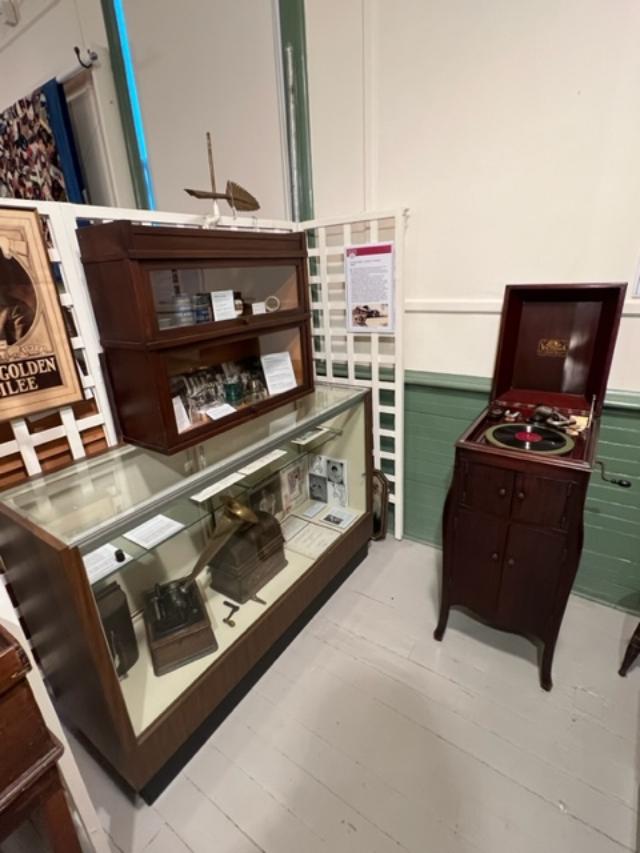 The Victorian Living Room features many plush pieces of furniture, decorative knick-knacks that used to dominate the décor and a graceful piano with mother of pearl keys and decorative carved sides. This model was one of maybe a hundred made for a very elite client. The display also featured one of the early record players that still works.