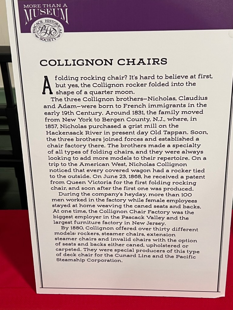 The exhibition is on the Collignon Chair factory of River Vale, NJ and the selection of chairs that the factory once manufactured.