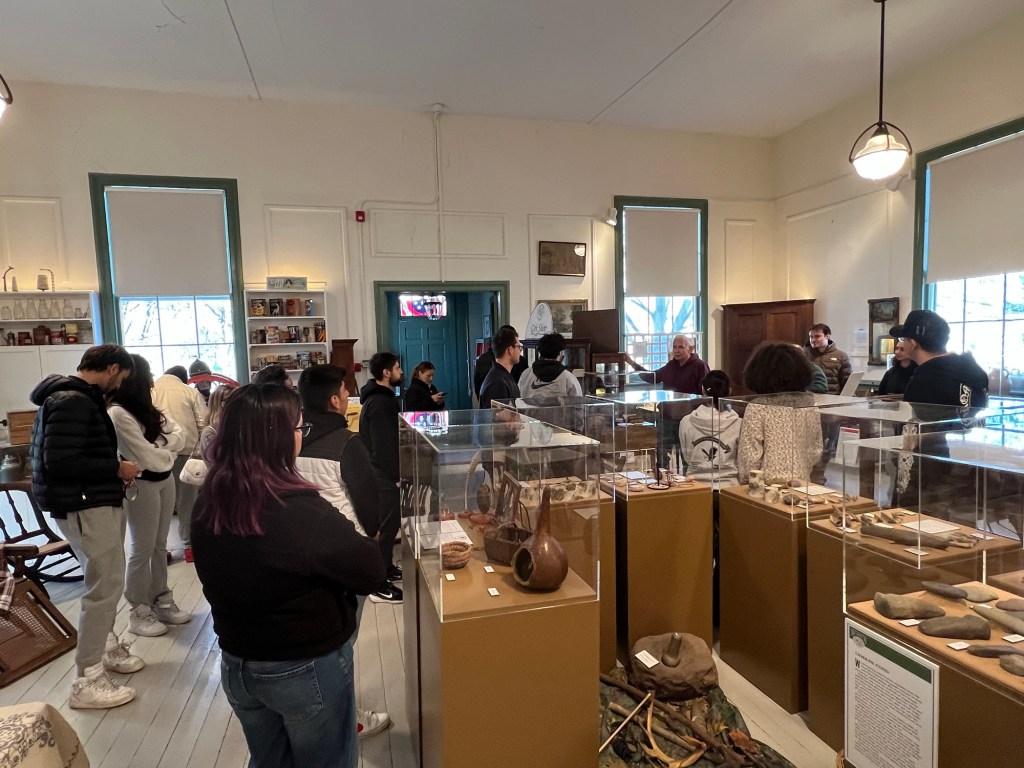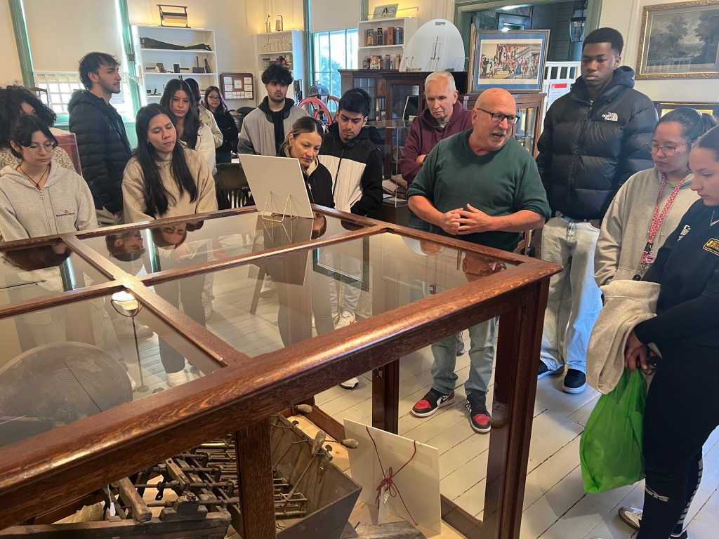 Peter Meany, the First Vice President of the Board explaining the Wampum machine to the students. This form of Native American currency is the only machine in the world like it and is a rare artifact.