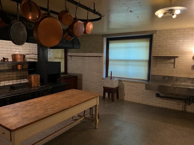 The Kitchen in the basement area is one of the areas of the home that survived the 1932 fire when the house burnt to the ground. It would not have been used in modern times as a more modern kitchen was built in the newer area of the house. Still, this was decorated for the holidays to show the bounty of the Fall harvest and the items that would have been served for the Christmas holidays.