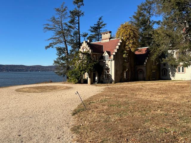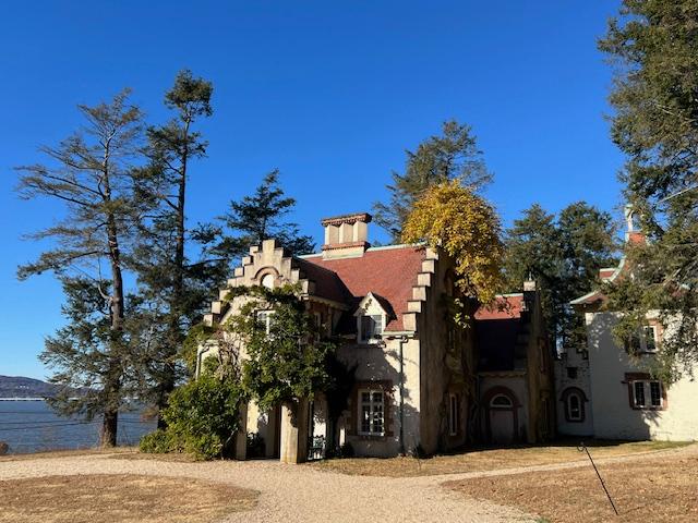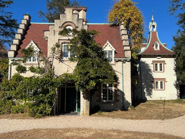 In 1872, the house was purchased by Joseph Stiner, a prominent New York City tea merchant. His alterations created the present lyrical structure. The exterior embellishments are extraordinarily festive with floral detailing in the cast iron cresting and railings and elaborately carved wood scrollwork and capitals – all painted in shades of rose, blue, violet and red. The interiors are equally decorative with painted and stenciled ceilings, trim with gold, silver and bronze leaf and unique eight-sided motifs in the plasterwork, woodwork and etched glass (Visiting Westchester blog).