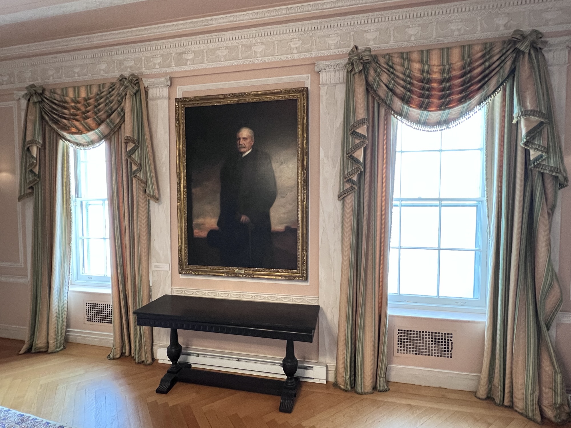 In 1891 the couple commissioned the Boston architectural firm of Rotch & Tilden to construct a summer home and carriage house on property they named Whippany Farm for the river nearby. The Colonial Revival style is evident in such details as the Federal urns and swags, Ionic columns on the porte-cochere and the large Palladian window on the second floor landing.