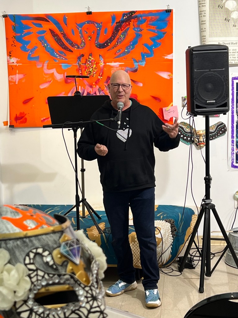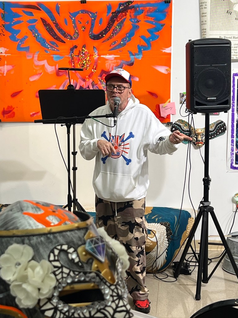 The artist giving his opening remarks at the show. This one man show was a combination of his personal At ex and that of his students.