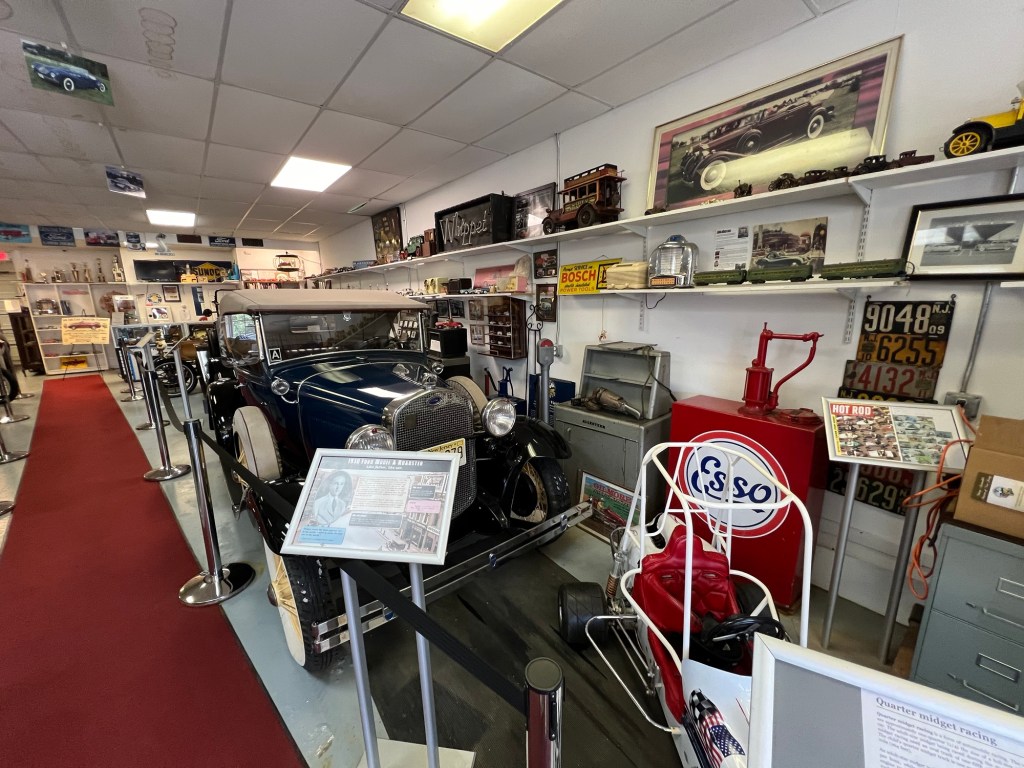 On the side walls there are secondary collections of driving accessories, pictures of cars and a small collection of toy cars in one of the cases. It is the perfect museum for car buffs or for visitors interested in the history of automobiles. It is perfect for those who love the silent films and early American engineering. These pristine cars are lined like jewels on a carpet that are meant to impress.