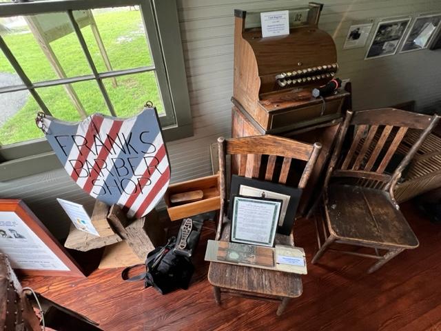 On display are artifacts from Russell Farms, a barber chair from longtime Wyckoff barber, Frank Muscara, a 1905 child’s dress, Lenape artifacts, a Hoosier cabinet and photographs.