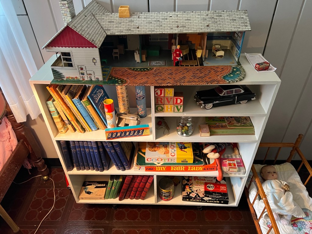 The shelves were lined with books and board games from the era of the late 50’s and 60’s