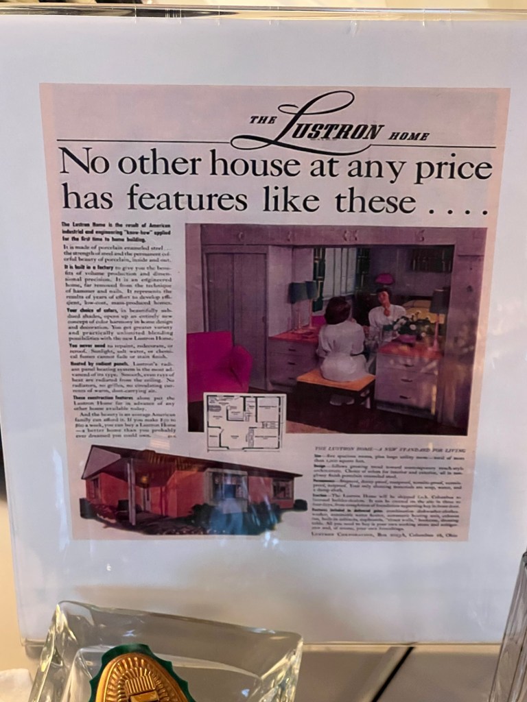 The Lustron house was the brainchild of Carl G. Strandlund, who saw the possibilities of utilizing steel left behind from the war effort to create needed housing. Strandlund had previously worked for the Chicago Vitreous Enamel Products Company that manufactured steel enamelware for refrigerators, stoves, and other household appliances. Connecting this technology to the housing industry was the ticket to success in securing federal funding necessary to start production. The Lustron Corporation opened a one-million-square-foot plant in Columbus, Ohio in 1947. But just as quickly as the company’s star rose, it plummeted, and the Lustron Corporation closed in 1950 due to overwhelming debt.