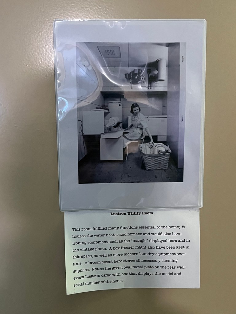 Interesting features of the Lustron house included the “Thor” dishwasher-clothes washing machine that was located in the cabinetry next to the kitchen sink. Another unique aspect of these homes was the heating system, which supplied radiant heat through a plenum chamber in the space above the metal ceiling panels. Each Lustron house came fitted with a metal identification tag stamped with the model and serial numbers and located on the back wall of the utility room.