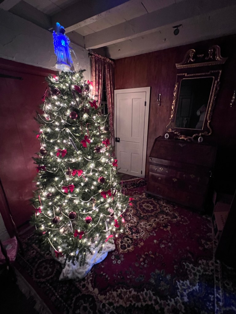 This cosy room was set up and lit for the holidays. The lights put a nice glow on the original woodwork.