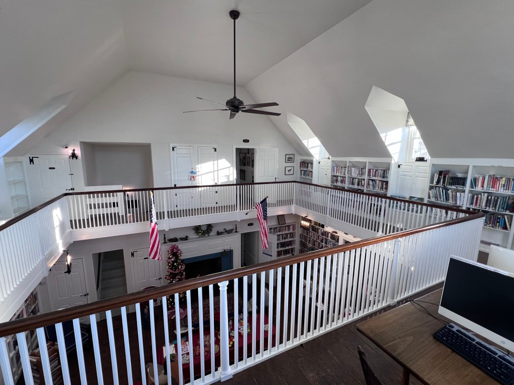 There are two large colonial-style working fireplaces on the first floor. One is in the main room and the other is behind it in the long back room on the ocean side of the library. Today this room houses the Mystery collection and its solid, ten-foot table makes it useful as a meeting room. In the early years, however, it served a different function–it was designated as the men’s reading room, and there male patrons could sit in large comfortable chairs to read magazines and newspapers. It was well lit by two tall French windows and it opened out onto the screened porch on the north side.