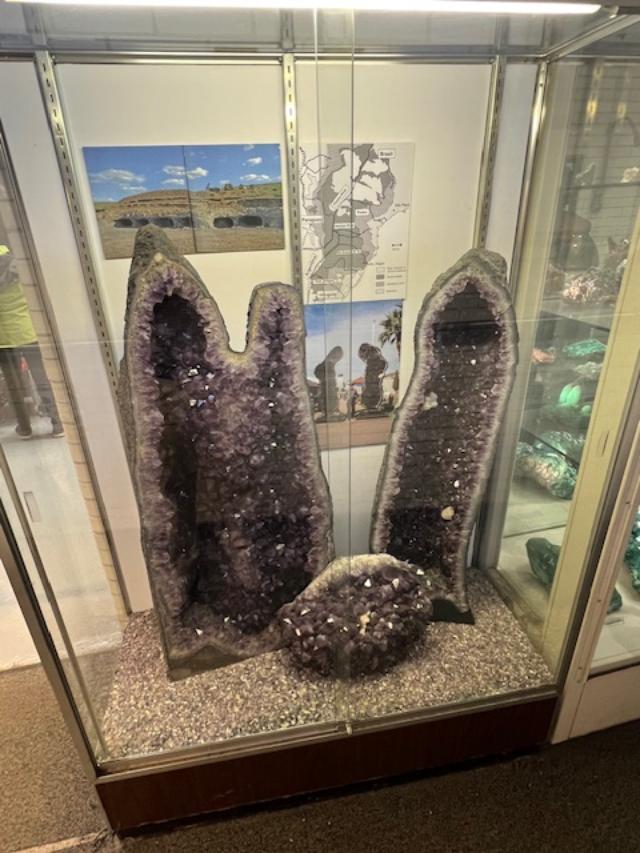 The gift shop has an array of tee shirts, books and gifts for sales. The walls are lined with minerals for sale.