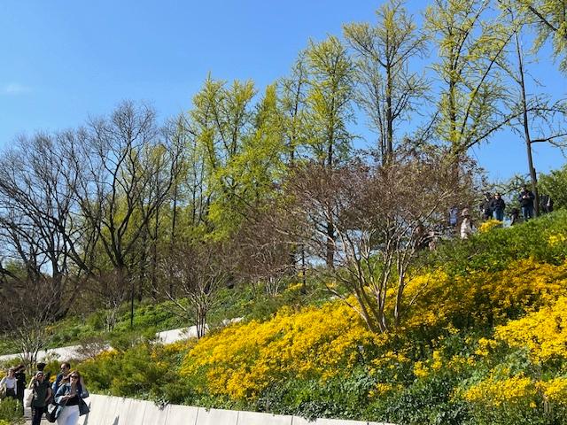 There are fields of yellow on yellow and yellow on orange flowers surrounding the paths against the backdrop of the green lawns. The whole hill is a sea of yellows and whites against the trees which are bursting with new buds. This beautiful scene lasts only about a week to two weeks at full bloom in the first weeks of April.