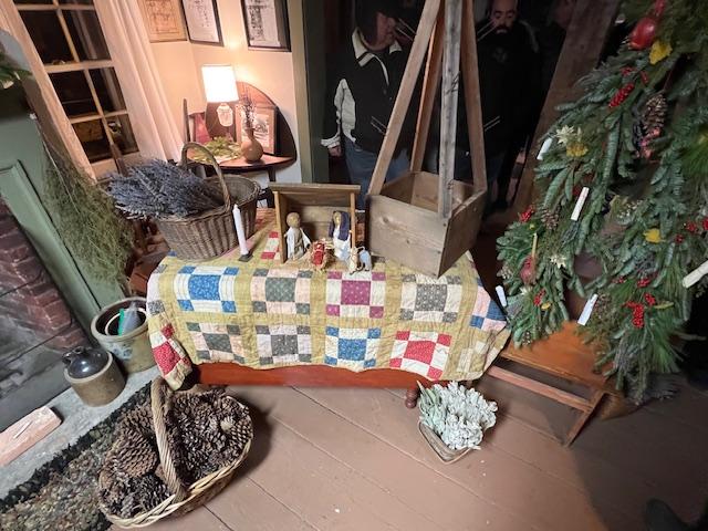The inside of the museum for the holidays in both 2021 and 2024 was decorated for the Christmas holidays with traditional Moravian decorations. The decorations included dried herbs, homemade decorations and a ‘Tower Tree’ which is made from a framework with pine branches and fruit and herb decorations that would reflex the times.