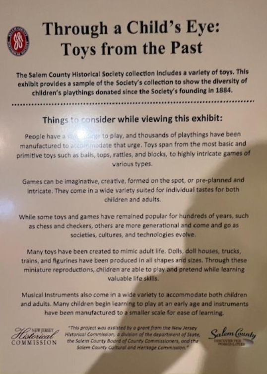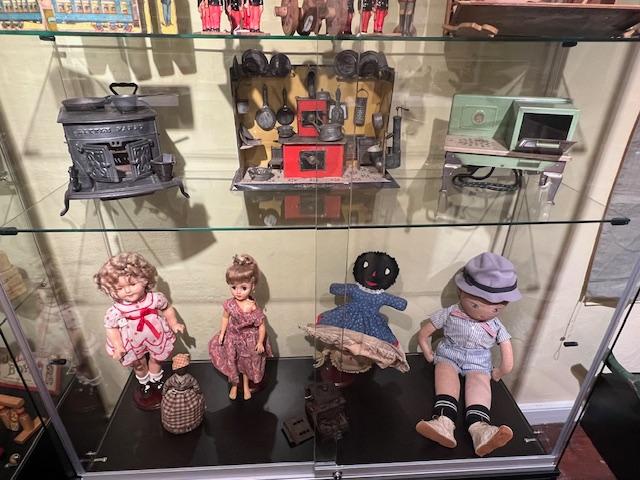 In 2023, the museum exhibited “Through a Child’s Eye: Toys from the Past” toys from the permanent collection. The museum had a collection of dolls, trucks, games and housekeeping play things. Toys from the Victorian era to the 1960’s were based on domestic roles and getting children ready for marriage. Items like dolls were for child rearing, tea sets for etiquette training for entertaining, trucks , cars and trains for transportation jobs and later on tinker toys and erector sets for thinking and construction. Items like board games were for socialization and thinking skills.
