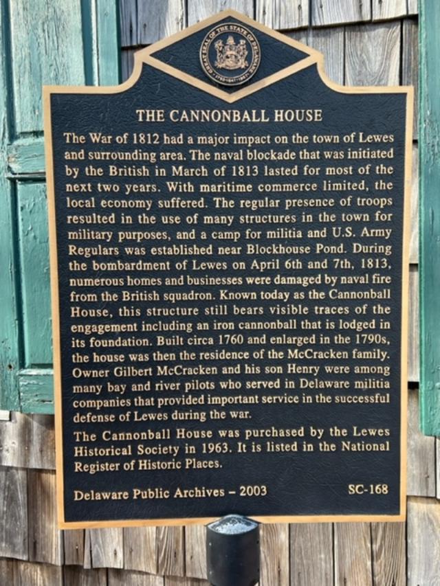 On April 5, 2003, the Cannonball House was honored by the State of Delaware for its close association with the Bombardment of Lewes by the British on April 6th and 7th, 1813 and as the home of two heroes of those fateful days, Gilbert McCraken and his son Henry, both Pilots of the Bay & River Delaware.