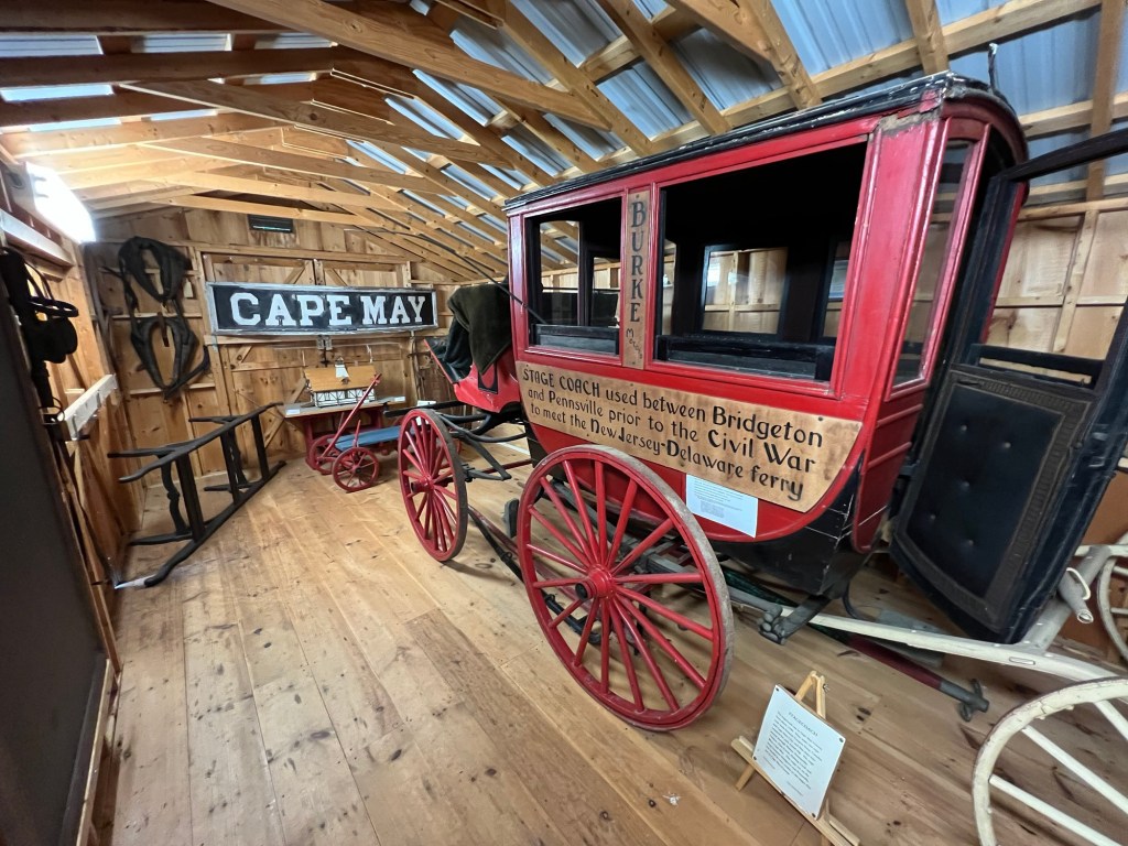 Period pieces range from the Revolutionary War to our country’s most recent involvement in Iraq and Afghanistan. Of special interest is the American flag that was carried by soldiers who hailed from Cape May County during the Civil War. The flag survived numerous battles, including Gettysburg, Spotsylvania, Bull Run and was at Lee’s surrender at Appomattox. The Carriage Shed houses items related to transportation – a vintage horse-drawn market wagon, a doctor’s sulky and an early stagecoach that ran between Bridgeton and Pennsville (from the museum website).