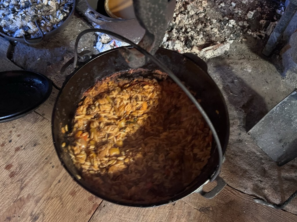 Cooking pies, soup, chestnuts and popcorn in the fireplace